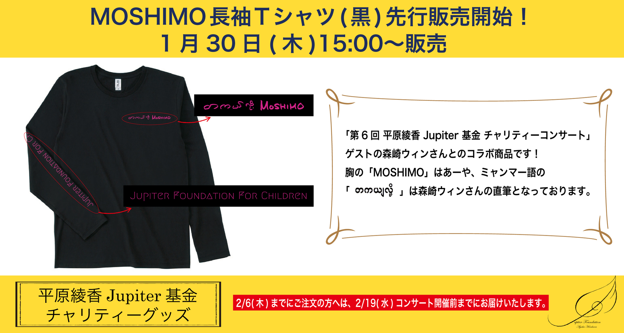2/19(水)開催の「第6回 平原綾香 Jupiter 基金 My Best Friends Concert ~ 顔晴れ(がんばれ)こどもたち ~」のチャリティー「MOSHIMO長袖Tシャツ(黒)」の先行販売を1/30(木)15:00より開始いたします!