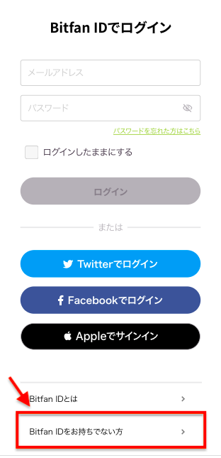 ※既にBitfan IDをお持ちの方は下記ページでメールアドレスとパスワードを入力して、⑧に進んでください。