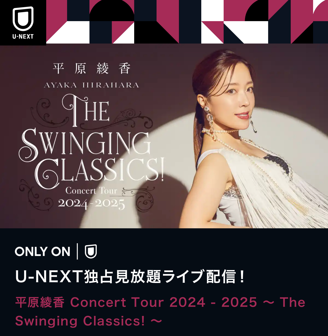 9月28日(日)に 渋谷・Bunkamuraオーチャードホールにて開催された「平原綾香 Concert Tour 2024 - 2025 〜 The Swinging Classics! 〜」のツアーファイナルの模様がU-NEXTにて生配信されましたが、この見逃し配信が10月3日(金)12:00よりスタートします。ぜひご視聴ください。